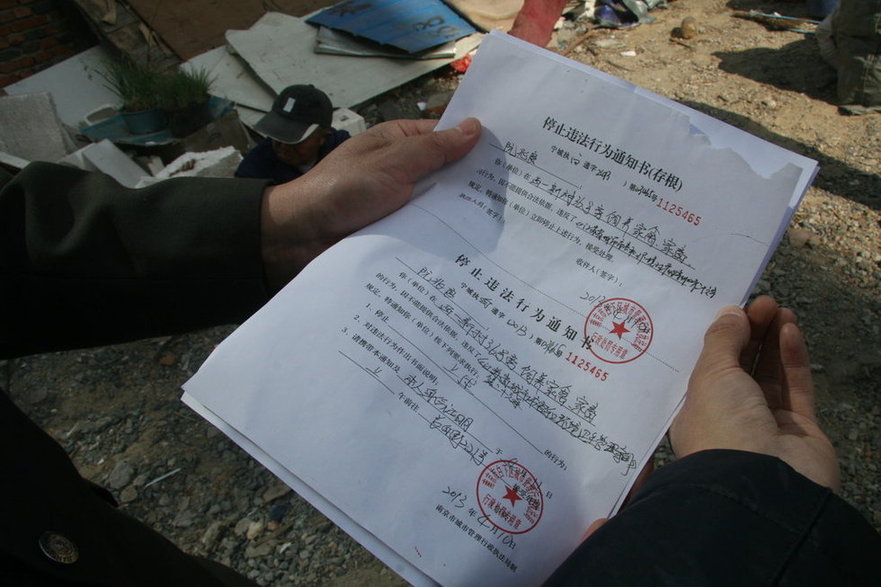 2013年4月10日,南京市白下區(qū)城市管理行政執(zhí)法局的同志來到該區(qū)西一新村36號(hào)大院,對(duì)該大院內(nèi)飼養(yǎng)雞的居民進(jìn)行現(xiàn)場(chǎng)處罰。南京市城管局近日發(fā)出了“最后通牒”,4月9日24點(diǎn)前,南京市區(qū)范圍內(nèi)(涉農(nóng)除外)居民須自行處理飼養(yǎng)的家禽家畜(雞、鴨、鵝、食用鴿、兔、羊)。圖為4月10日,在執(zhí)法人員的監(jiān)督下,飼養(yǎng)人將兩只雞當(dāng)場(chǎng)殺掉。
