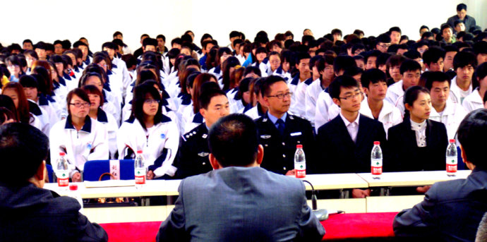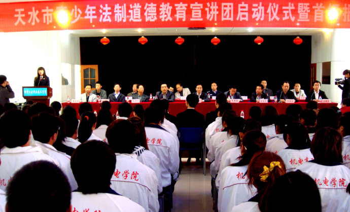 2013年4月19日,天水市青少年法制道德教育宣講團啟動儀式在甘肅機電職業(yè)技術(shù)學(xué)院大學(xué)生活動中心進行。參加啟動儀式的有市委、市人大、市政府、政協(xié)分管、聯(lián)系領(lǐng)導(dǎo),市委宣傳部、市綜治辦、市關(guān)工委、市中級人民法院、市檢察院、市公安局、市教育局、市司法局等預(yù)青成員單位負責人和機電學(xué)院領(lǐng)導(dǎo)、學(xué)生共計700多人。(辛啟榮 供稿)