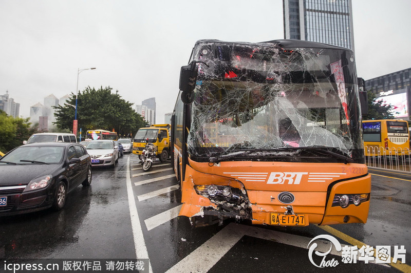 ???? 2013年7月1日17時(shí)25分許,廣州BRT體育中心站3輛公共汽車迎面相撞。事故致大約17人受傷,大部分為輕傷,其中一名11歲小孩眼部受傷,一名中年婦女因肋骨骨折住院。圖為相撞車輛擋風(fēng)玻璃嚴(yán)重?fù)p毀。(來源:東方IC)