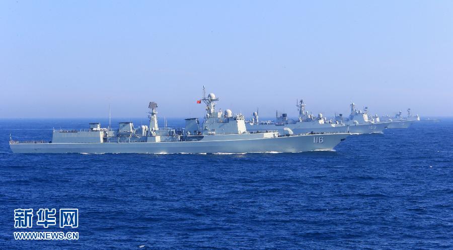 ????7月3日,赴俄羅斯參加中俄“海上聯(lián)合—2013”軍事演習的中國海軍艦艇編隊,在日本海進行編隊運動訓練。這是編隊在進行編隊齊轉航行訓練。新華社記者查春明攝