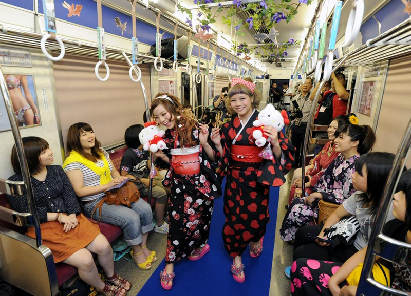 ???? 據(jù)日本《產(chǎn)經(jīng)新聞》7月8日報道,日本大阪市市營地鐵御堂筋線列車7日上演了一場“地鐵時裝秀”,性感美艷的模特們身著和服、泳裝在車廂內(nèi)自由穿梭,為乘客們送上絲絲清涼。