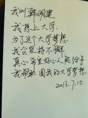 ????采訪結(jié)束時,韓明建用雙手夾著筆給記者寫下了一段話:“我叫韓明建,我想上大學(xué),為了這個大學(xué)夢想,我會堅持不懈,真心希望好心人能給予我?guī)椭?,圓我的大學(xué)夢想。”