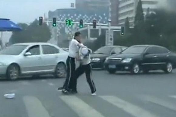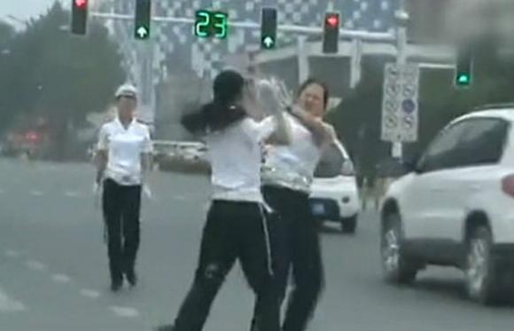 ????這段1分零4秒的視頻中顯示,兩名女性穿著警服在大街上拽著對方頭發(fā)死命扭打,絲毫不顧及當時的交通情況。視頻播放到第15秒時,出現另外一名著警服女性過來勸架,經過39秒的勸解,才平息了“戰(zhàn)火”。視頻中,不時傳來市民“連車都不管了”、“交警都能打起來,這是新聞啊”、“帽子都掀了”的評論,同時還有很多人的嬉笑聲。圖為唐山兩“女交警”當眾廝打(視頻截圖)。