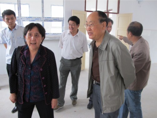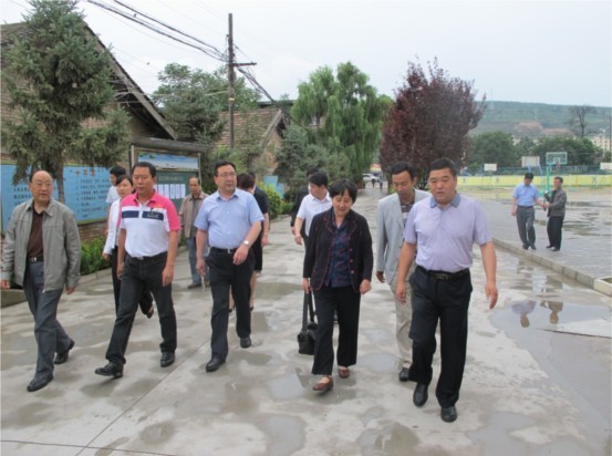 ????(中國關(guān)工委兒研中心春苗營養(yǎng)廚房項目辦常務(wù)副主任宋立英(右三)在省、市、縣相關(guān)領(lǐng)導(dǎo)的陪同下檢查麥積區(qū)馬跑泉中學(xué)項目前期準備工作)