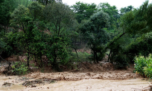????(秦州區(qū)娘娘壩鎮(zhèn)郭家鞍子村附近山洪暴發(fā),交通中斷,道路兩旁山體出現(xiàn)滑坡現(xiàn)象)