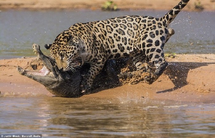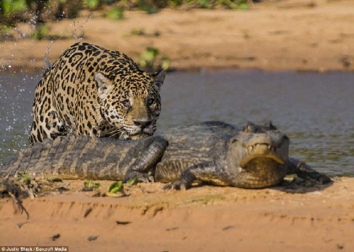 ????攝影師詳細描述了這只美洲豹獵殺鱷魚的全過程:“它利用植物當掩護,慢慢地下水,徑直向鱷魚游去。在河中時,它盡可能地將身體潛入水里。在到達岸邊時,它突然躍出水面,從鱷魚的尾部對其發(fā)動突然襲擊。它左右兩爪配合控制住鱷魚,同時向它的頭部和脖子持續(xù)發(fā)動致命的攻擊。隨后,美洲豹用嘴叼著鱷魚向河的另一邊游去,當它到達河對岸時,便帶著它的獵物迅速消失在草叢中。”
