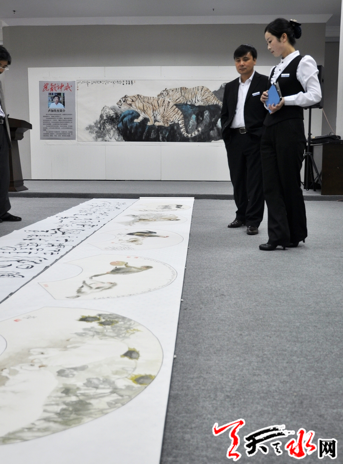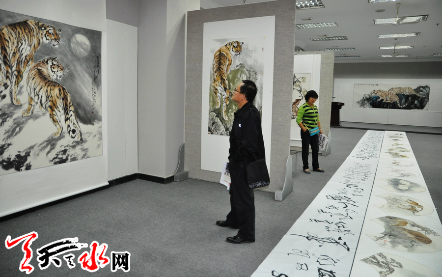 ????10月6日,生于山東陽谷縣的盧加帶著40多幅精品繪畫作品在天水市金龍大廈隆重舉辦個展。偌大的展廳,一幅幅巨型的寫虎佳作仿佛讓人走進了虎的世界:形態(tài)各異、情狀萬種,或上山或下山,或坐臥月下,或靜觀或長嘯的老虎,俊朗昂然充滿靈性,威猛雄壯空靈超脫。