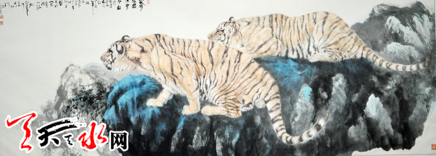 ????《威震寰宇》、《雄風(fēng)》、《嘯月》、《登高》、《雙雄圖》……一件件栩栩如生的寫虎畫作,令觀者驚嘆,更讓人讀出的是一種包含哲理的美,是一種蘊涵著主題意念的筆墨情感。