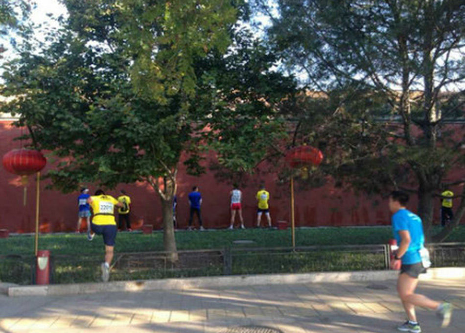 北京馬拉松選手集體在紅墻小便