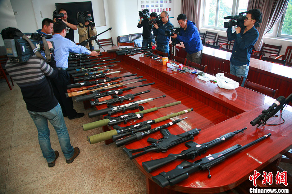 ????10月24日,在浙江臨安市公安局的辦公室內(nèi),民警將43把大小長短不一的各色槍支陸續(xù)排列在辦公桌前。今年以來該地區(qū)最大一起涉毒涉槍案宣告破獲,此案被公安部列為目標特大武裝販毒案件。50名涉槍涉毒分子落網(wǎng),繳獲各類槍支43把、彈藥3566發(fā)、冰毒2.9公斤、麻古300余顆。中新社發(fā) 李晨韻?攝