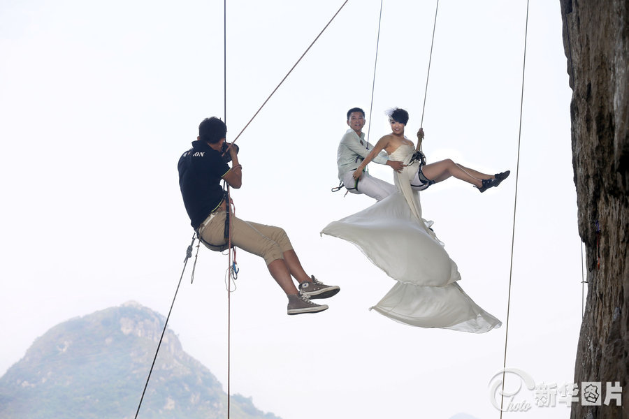 “女漢子”穿婚紗攀巖 拍攝酷炫婚紗照
