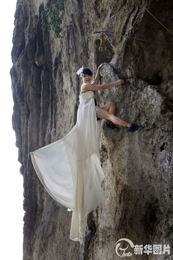 “女漢子”穿婚紗攀巖 拍攝酷炫婚紗照