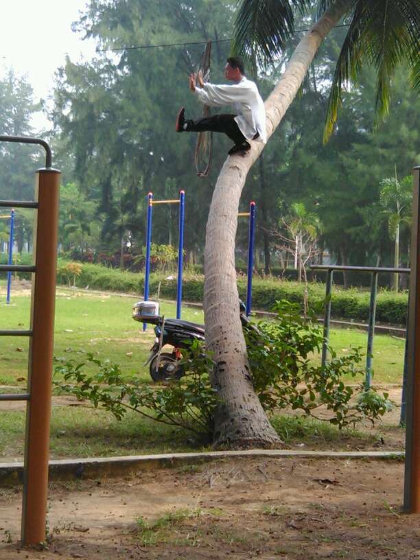 ????“海南大學(xué)內(nèi)驚現(xiàn)神人,椰子樹上練功?!苯眨@樣一則圖片內(nèi)容在網(wǎng)上火了。從照片看,練功者為一白衣男子,其先在草地上練功,隨后鏡頭轉(zhuǎn)到距離地面有四五米高的椰子樹上,白衣男子在樹上練功,時(shí)而金雞獨(dú)立,時(shí)而單腿蹲坐,一招一式鎮(zhèn)定自若,頗有大家風(fēng)范。