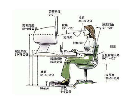 ????保持頸部直立,使頭部獲得支撐,兩肩自然下垂,上臂貼近身體,手肘彎曲呈90度;用間盤或鼠標(biāo)時(shí),應(yīng)盡量使手腕放松,保持水平姿勢,手掌中線與前臂中線保持一直線;腰部要挺直,膝蓋自然彎曲呈90度,并維持雙腳著地的坐姿。