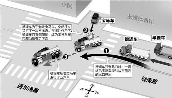 ????超車的槽罐車駕駛員沒想到,右前方一個小路口突然躥出一輛紅色寶馬車,打算橫穿城南路。