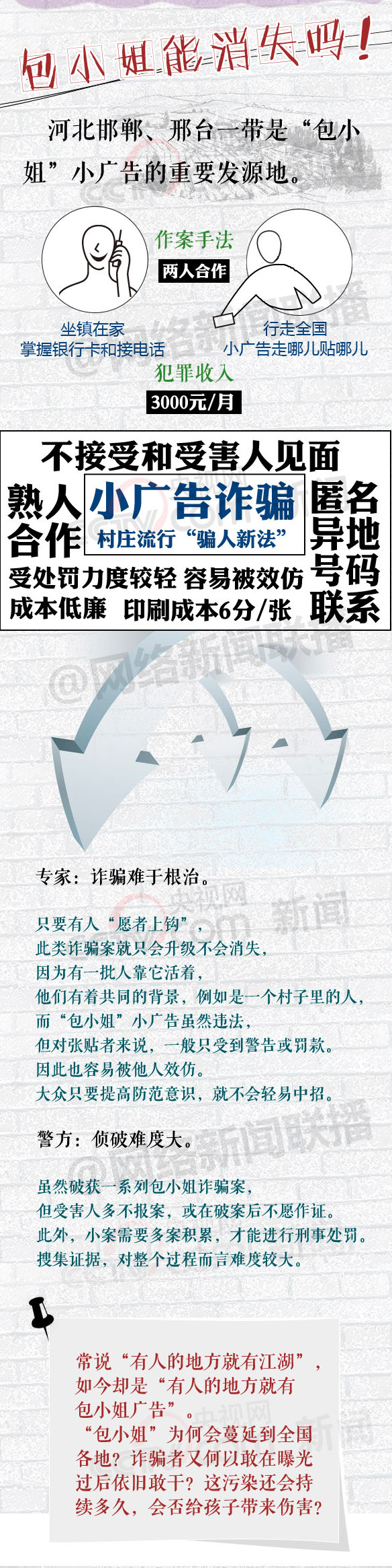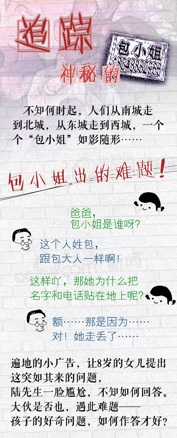 ????【導(dǎo)讀】一段時(shí)間來,在一些城市的大街上,貼在地面上的“包小姐”小廣告隨處可見,神秘的“包小姐”到底是誰呢? “包小姐”貌似色情服務(wù),實(shí)為詐騙。中招者“偷雞不成蝕把米”,往往上了當(dāng)還只能打掉牙往肚子里咽,不敢聲張。在提醒某些“好那口”的人提高警惕、遠(yuǎn)離騙子的同時(shí),還是想再說說那個(gè)困惑我們很久的老問題——“包小姐”之類的非法小廣告,何以屢禁不止,至今仍能招搖過市呢??