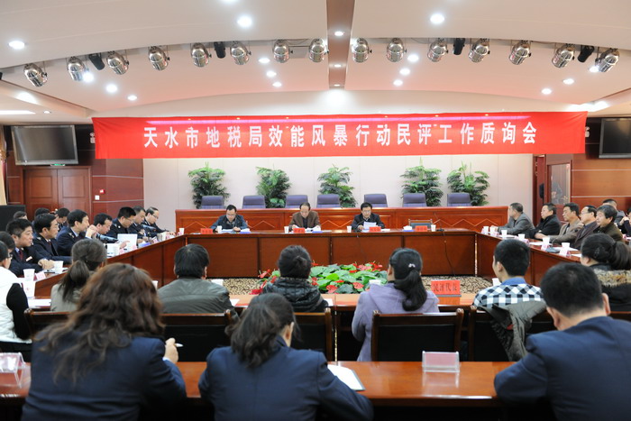 ????11月6日下午,天水市地稅局召開(kāi)了2013年度效能風(fēng)暴行動(dòng)民主評(píng)議機(jī)關(guān)作風(fēng)和政風(fēng)工作質(zhì)詢大會(huì)。市紀(jì)委糾風(fēng)室負(fù)責(zé)人、市第五行評(píng)組成員、民評(píng)代表,市局領(lǐng)導(dǎo)班子及全體干部參加會(huì)議。