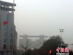 ????圖為連日來浮塵圍困中的酒泉市區(qū)?!顟c華 攝