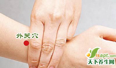 ????外關(guān)穴位于人體的前臂背側(cè),尺骨與橈骨之間,腕背橫紋上2寸處,與正面內(nèi)關(guān)穴相對。按摩此穴主要治療熱性疾病,如高熱、上火、便秘等。按揉時,注意每次都要順著穴位向下進行推按。