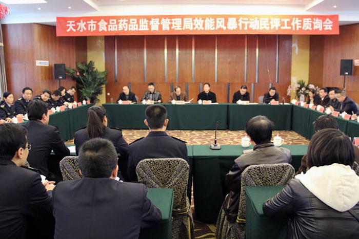 ????11月21日下午,天水市食品藥品監(jiān)督管理局召開了2013年效能風(fēng)暴行動民主評議機(jī)關(guān)作風(fēng)和政風(fēng)行風(fēng)質(zhì)詢評議會。會議由市第二行評組組長主持。市紀(jì)委、市效能風(fēng)暴行動第二行評組、行評代表和服務(wù)對象及市食品藥品監(jiān)督管理局局干部職工共計88人參加了會議。?
