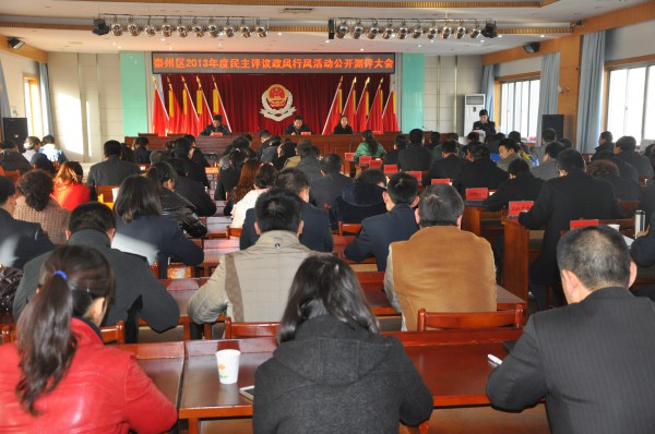 ????為全面準(zhǔn)確掌握部門(mén)行業(yè)效能作風(fēng)狀況的群眾滿意度,進(jìn)一步加強(qiáng)民主監(jiān)督,促進(jìn)機(jī)關(guān)作風(fēng)政風(fēng)行風(fēng)不斷轉(zhuǎn)變,11月28日,秦州區(qū)召開(kāi)效能風(fēng)暴行動(dòng)民主評(píng)議機(jī)關(guān)作風(fēng)和政風(fēng)公開(kāi)測(cè)評(píng)大會(huì),對(duì)2013年度30個(gè)受評(píng)部門(mén)單位效能作風(fēng)狀況進(jìn)行公開(kāi)民主測(cè)評(píng)。