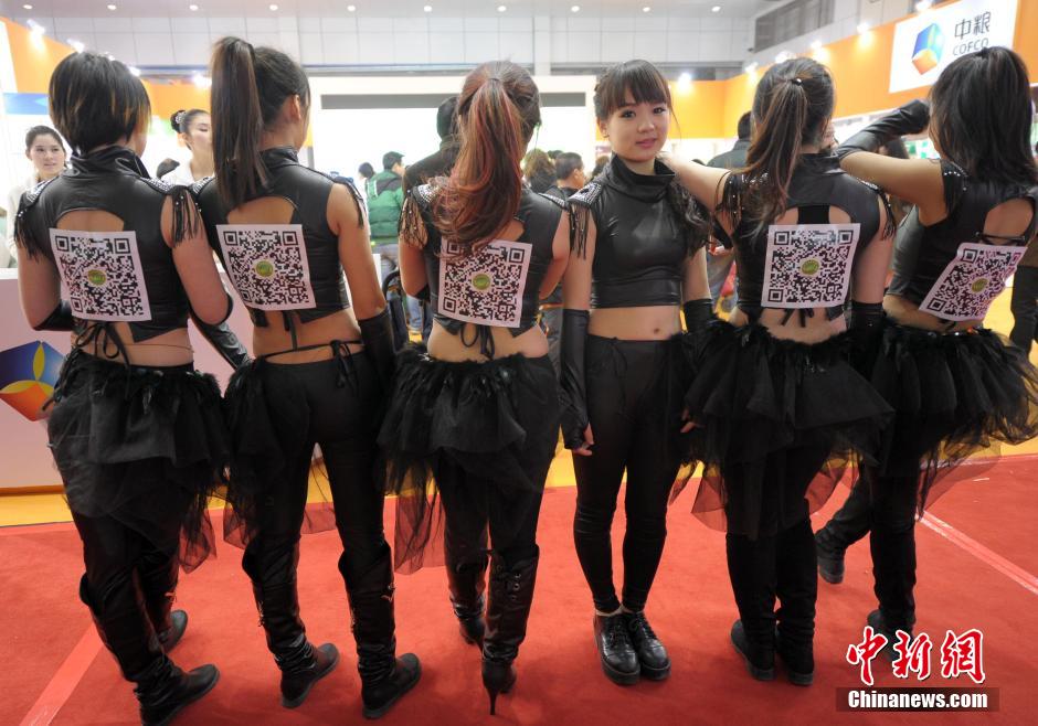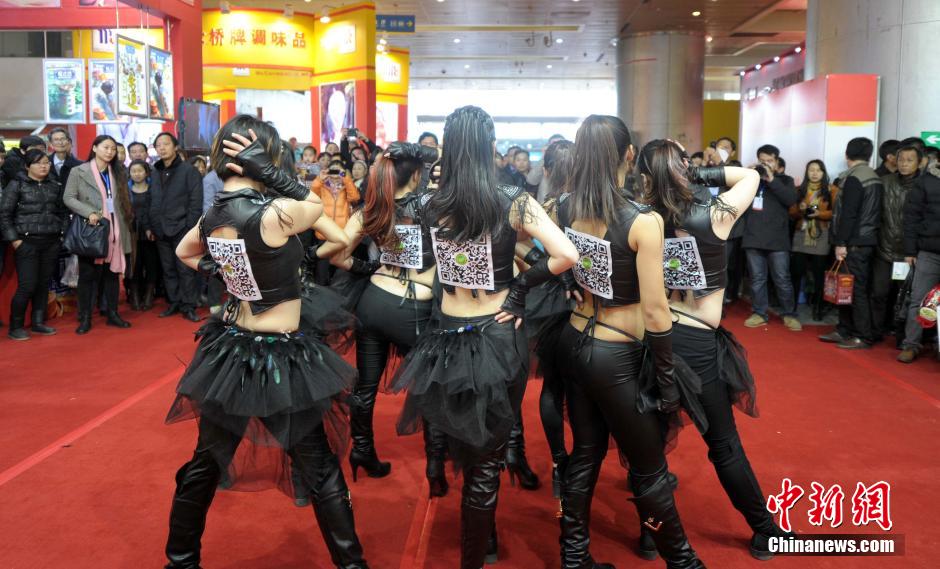 ????12月12日,一群身著黑衣露臍裝、超短裙的火辣美女,背后印著碩大的二維碼為第22屆中國(guó)食品博覽會(huì)站臺(tái),吸引參觀者的眼球。當(dāng)日,第22屆中國(guó)食品博覽會(huì)暨交易會(huì)在武漢開(kāi)幕。本屆食品博覽會(huì)有“神十”航天食品、有機(jī)綠色的天山雞等共2.3萬(wàn)多種新特農(nóng)產(chǎn)品供武漢市民品嘗挑選。中新社發(fā)張暢 攝