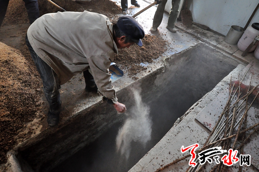 “村里九成以上的村民都姓杜,解放以后在天水及隴南開辦的酒廠里的釀酒師傅大多都是從我們竹林村走出去的”,12月12日記者走進(jìn)有著悠久釀酒傳統(tǒng)的秦州區(qū)秦嶺鄉(xiāng)竹林村采訪時(shí)一位杜姓村民說,因這些年村里多數(shù)青壯年勞力外出打工,村里目前就剩一戶人家還保留著這種傳統(tǒng)的釀酒作坊,在維系著竹林村手工釀酒的傳統(tǒng)。記者尋著村民指引的方向,走進(jìn)飄散有酒香的這間農(nóng)舍時(shí),酒糟在鐵鍬的不斷翻鏟下,發(fā)酵后的五谷發(fā)生著質(zhì)的變化,不斷升騰的蒸氣伴著濃濃的酒香頃刻間把在這里忙碌的幾個(gè)農(nóng)民置于“仙境”之中,在這里你會體味出推杯換盞、觥籌交錯(cuò)之外的傳統(tǒng)釀酒的結(jié)構(gòu)美、個(gè)性美、風(fēng)味美、意境美的酒之美學(xué)內(nèi)涵。作為一種重農(nóng)業(yè)文化的反映,中國酒之所以歷經(jīng)數(shù)千年的滄桑巨變而不衰,其生命力還表現(xiàn)在有著延承不衰傳統(tǒng)釀造的工藝上,與充盈于現(xiàn)代高科技的釀酒技術(shù)相比,這種有著歷史淵源且流傳于民間的傳統(tǒng)手工釀酒工藝更能體現(xiàn)出“香為酒之形,味為酒之魂,觸為酒之體”的酒之內(nèi)美。