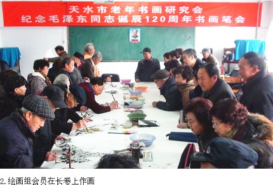 ????2013年12月26日, 天水市老年書畫研究會舉辦紀(jì)念毛澤東誕辰120周年書畫筆會, 創(chuàng)作了兩幅長卷, 以此表達對偉人毛澤東及其豐功偉績的崇敬之情和緬懷之意, 以示要在黨的十八屆三中全會精神指引下, 緊密團結(jié)在以習(xí)近平同志為總書記的黨中央周圍, 為實現(xiàn)中國夢傳遞正能量. 努力作出新貢現(xiàn).