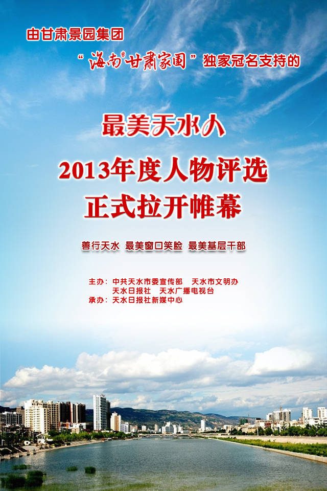 ????天天天水網(wǎng)訊 經(jīng)過緊張籌備,備受社會各界關(guān)注的“最美天水人”2013年度人物評選今日起啟動。這次由甘肅景園集團海南.甘肅家園獨家冠名支持的典型人物評選活動,將從在過去一年中市屬各媒體挖掘采訪的八十余位“最美天水人”候選人中選出最終“善行天水”、“最美窗口笑臉”和“最美基層干部”三個門類的共計30位殊榮獲得者并予以表彰。