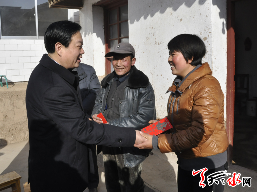 ????春節(jié)就要到了,“雙聯(lián)”聯(lián)系戶的生活怎么樣?還有哪些困難?帶著對雙聯(lián)“親戚”的牽掛,1月21日,中共天水市委副書記、市長楊維俊輕車簡從,深入雙聯(lián)點秦州區(qū)中梁鄉(xiāng)楊家山村、草胡村和甘谷縣武家河鄉(xiāng)武家河村,看望慰問“雙聯(lián)”聯(lián)系戶,了解他們的生產生活情況,給他們送去了慰問金,祝愿他們過一個歡樂祥和的春節(jié)。