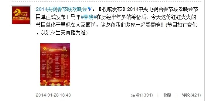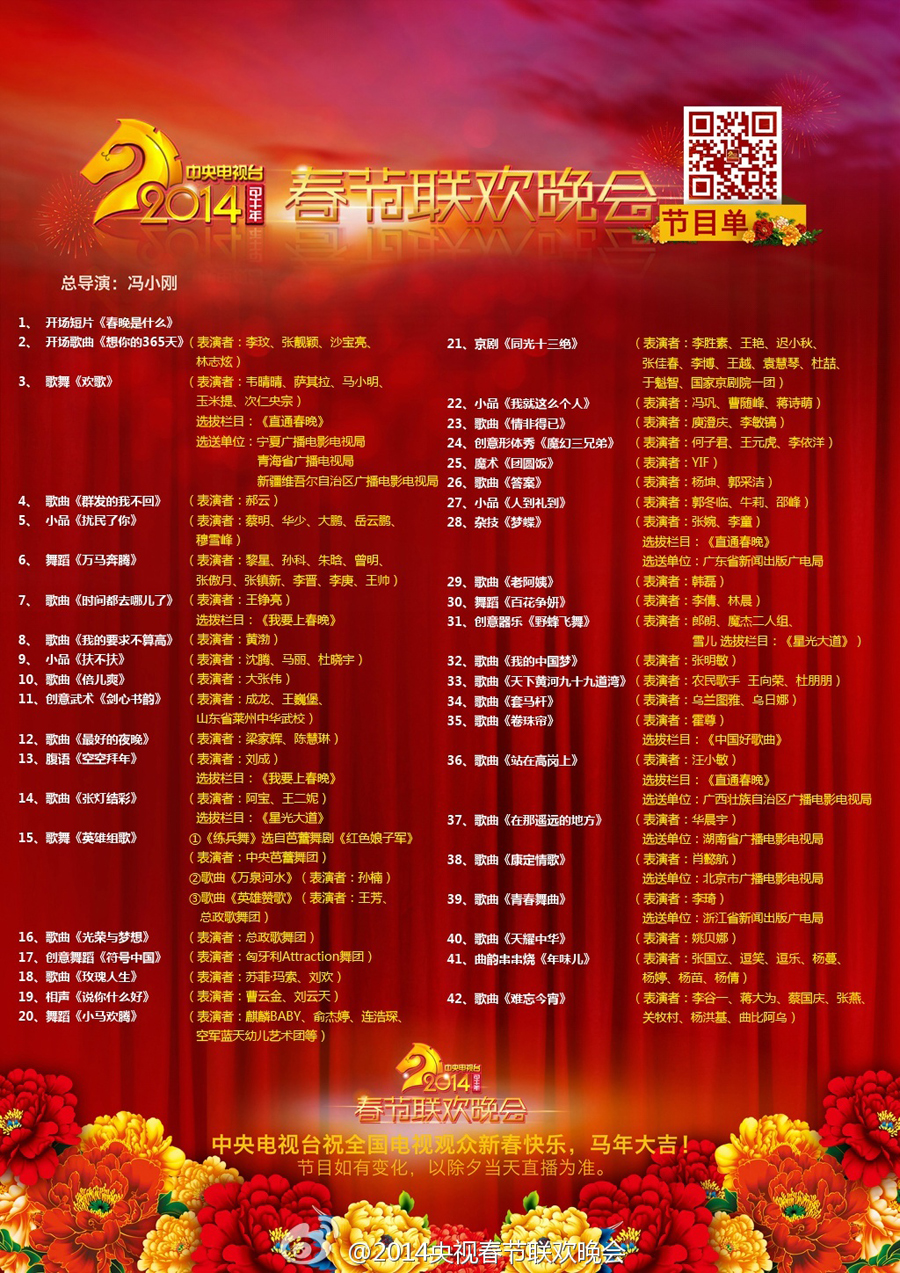 ????據(jù)馬年央視春晚官方微博消息,2014中央電視臺(tái)春節(jié)聯(lián)歡晚會(huì)節(jié)目單今日正式發(fā)布。其中語(yǔ)言類(lèi)節(jié)目?jī)H有5個(gè)。李玟、張靚穎、沙寶亮、林志炫獻(xiàn)唱開(kāi)場(chǎng)歌曲《想你的365天》,蘇菲-瑪索和劉歡合唱《玫瑰人生》,庾澄慶李敏鎬合唱《情非得已》,成龍表演創(chuàng)意武術(shù),姚貝娜將在零點(diǎn)跨年演唱,成龍將搭檔他人表演創(chuàng)意武術(shù),而由李谷一、蔡國(guó)慶演唱的《難忘今宵》仍舊是晚會(huì)的最后一個(gè)節(jié)目。(圖片來(lái)源:央視春晚官方微博)