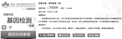 ????昨日,記者走訪一些體檢中心發(fā)現(xiàn),雖然兩部委叫?;驕y(cè)序臨床應(yīng)用的通知已公布數(shù)日,但是不少基因檢測(cè)項(xiàng)目仍在正常經(jīng)營,且價(jià)格懸殊,慈銘體檢公司北京奧亞醫(yī)院(以下簡稱“慈銘奧亞”)的“基因檢測(cè)”體檢套餐價(jià)格高達(dá)76000元,僅檢測(cè)68項(xiàng)基因的價(jià)格為34000元。