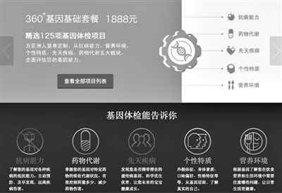 ????同時(shí),一家名為360°基因的網(wǎng)站提供的125項(xiàng)基因檢測(cè)的基礎(chǔ)套餐價(jià)格為1888元。
