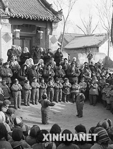 ????1960年春節(jié),河南省鄭州市區(qū)古滎人民公社幼兒院的孩子們?yōu)榫蠢显旱臓敔斈棠萄莩鲂」?jié)目,給老人拜年。 新華社發(fā)