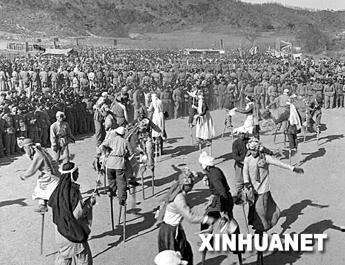 ????1954年,在朝鮮前線某地的中國人民志愿軍與朝鮮人民一起歡度勝利后第一個春節(jié)。這是歡度春節(jié)的集會上,中國人民志愿軍戰(zhàn)士在表演化裝高蹺。 新華社發(fā)