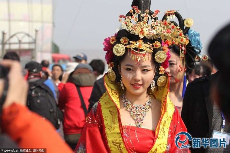 2014年3月16日,青島,即墨田橫祭海節(jié),海神娘娘的出現(xiàn)再次給祭?;顒訋砀叱保藗兗娂妵^四名身著古典服飾的美女裝扮成的海神娘娘。相傳海神娘娘是漁民的保護神。由于海島人世代以打魚為生,因此對海神娘娘信奉有加,至今還流傳海神娘娘高擎神燈保佑迷航遇險的漁船平安歸港的動人故事。(圖片來源:CFP)