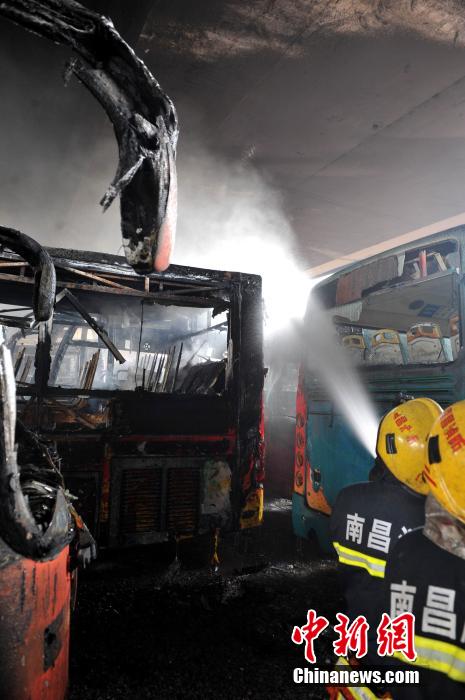 南昌一大橋下20余輛廢舊公交車起火被燒毀