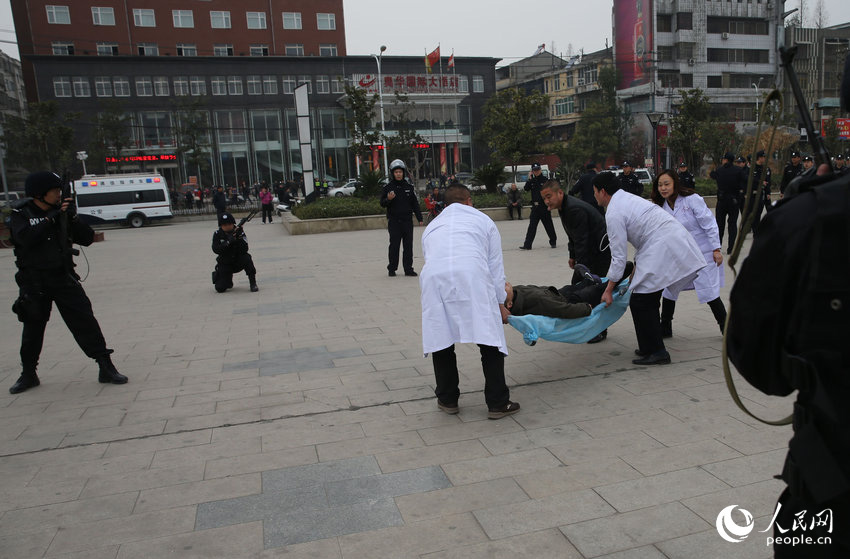 ????醫(yī)護(hù)人員搶救被特警擊中的持刀行兇者。王虎/CFP