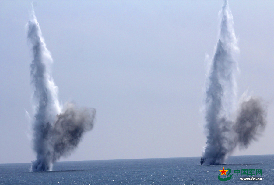 3月18日,南海艦隊某大隊由3艘獵潛艇組成編隊與潛艇對抗演練。編隊指揮員根據(jù)海情形勢分析,果斷指揮,命令編隊按照攻潛隊形散開,擴大與目標的舷角。發(fā)現(xiàn)目標后,編隊立即從不同方向、不同距離發(fā)射數(shù)枚火箭深彈直撲大海深處。來源:中國軍網(wǎng) 通訊員 胡開元 攝