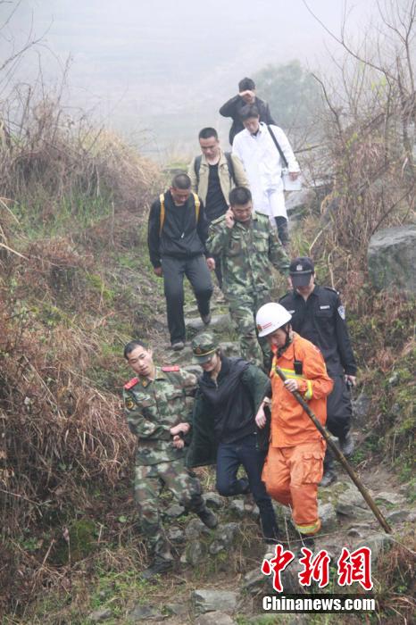 ????3月23日,江西宜春明月山崎嶇的山路上,兩名消防官兵攙扶著一名受傷的女大學(xué)生下山。陳乃國(guó) 攝