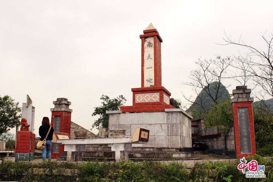 墓地有小橋流水亭臺(tái)樓閣 。 整個(gè)像是名勝古跡一般?!巴梁滥埂庇蓻鐾ぁ⑴_(tái)階、石柱、圍墻、祭壇、墓室和石碑組成,墓前有一座紅色的涼亭,內(nèi)有石桌和石凳,涼亭前有潺潺的溪水流過。墓室四周以及基座的石板上,雕刻或鑲嵌著不少精美的字畫,正后方圍墻上有一個(gè)石制龍頭,似乎在翹首仰望著石碑。紅色的石碑高約六七米,下刻“萬古城”,上刻“南天一地”,碑頂為黃色的金字塔狀尖頂。