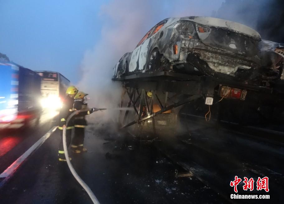 4月2日凌晨4時30分左右,大廣高速江西贛州段一輛滿載轎車的貨車突然起火,20余輛全新轎車起火,價值約400萬的新車付之一炬。陳沛志 攝