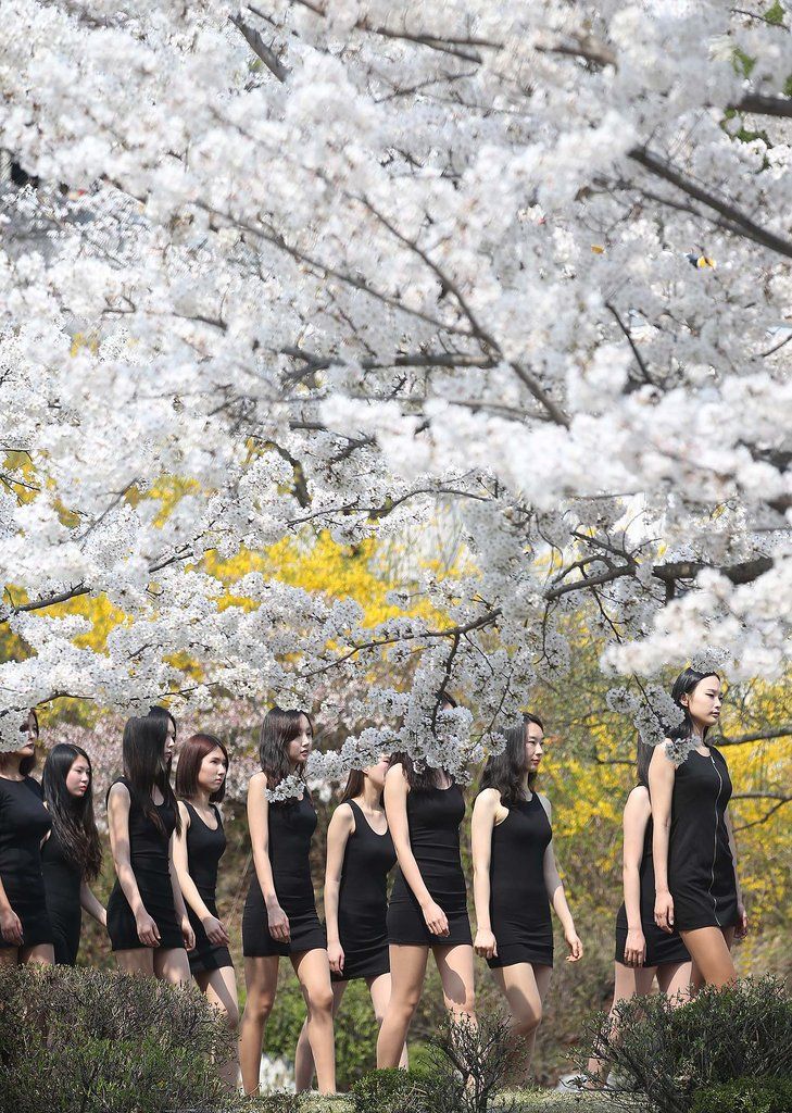 韓國(guó)模特女學(xué)生櫻花樹下上課
