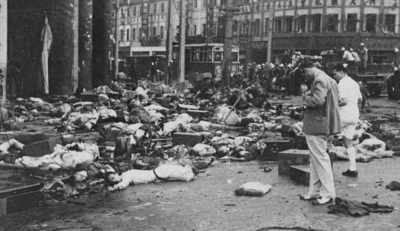 轟炸結(jié)束后,上海街頭尸橫遍地,圖中站立者為里昂。