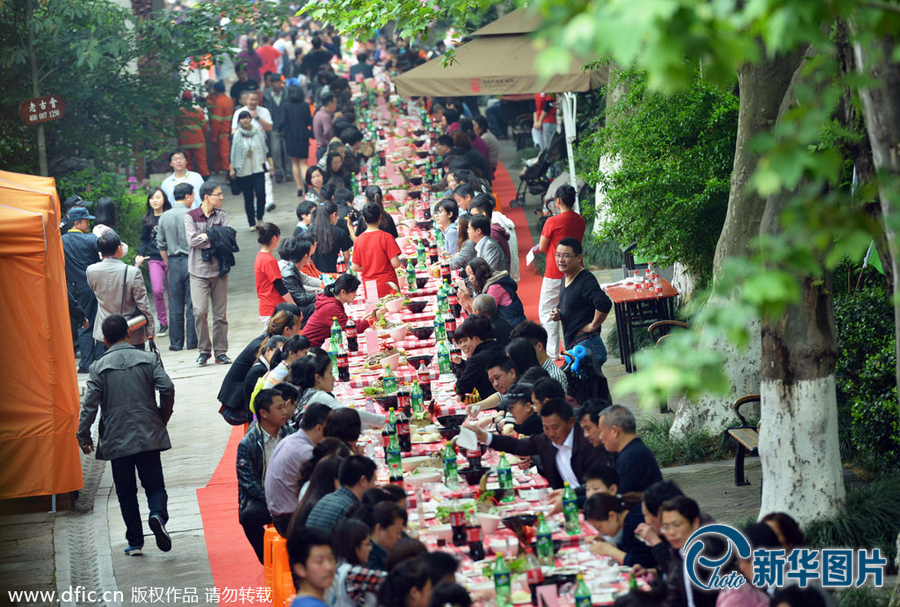 ????2014年4月26日,2014第五屆杭州拱墅運(yùn)河美食節(jié)系列活動(dòng)“?!痹诖蠖德贰叭Q纭绷魉诖蠖德窔v史街區(qū)舉辦。這場(chǎng)宴席由138張桌子拼接,長(zhǎng)約450米,100多位廚師共同打造2346盤菜肴,供1099人同時(shí)進(jìn)餐。圖片來(lái)源:東方IC