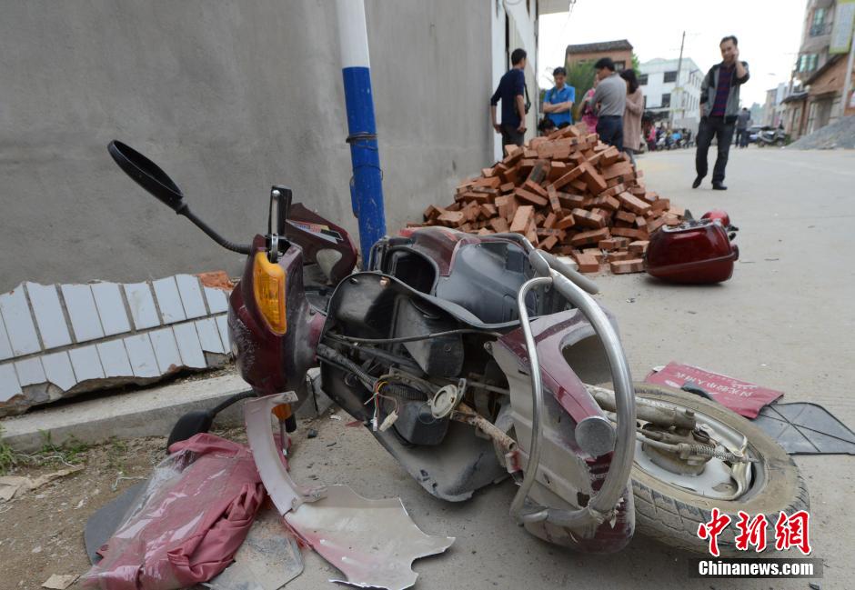 ??? 4月28日,福建省福州市閩侯縣發(fā)生一起惡性駕車(chē)撞人事件,圖為事發(fā)現(xiàn)場(chǎng)被撞毀的摩托車(chē)。中新社發(fā) 劉可耕 攝