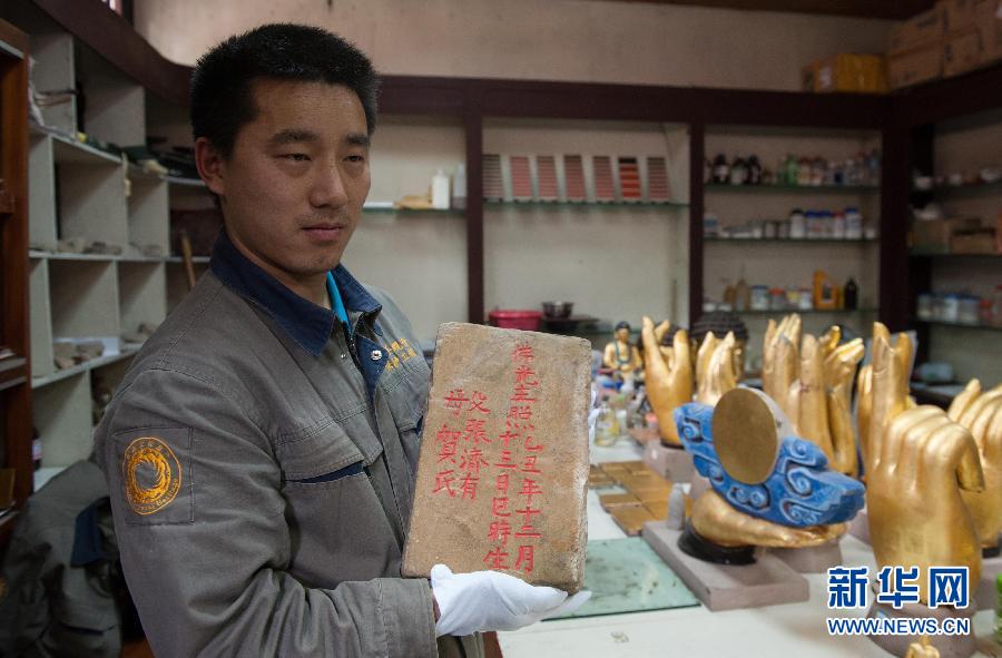 ????5月7日,文物修復(fù)人員在展示千手觀音造像發(fā)現(xiàn)的年代石磚題記背面。新華社記者 劉潺 攝