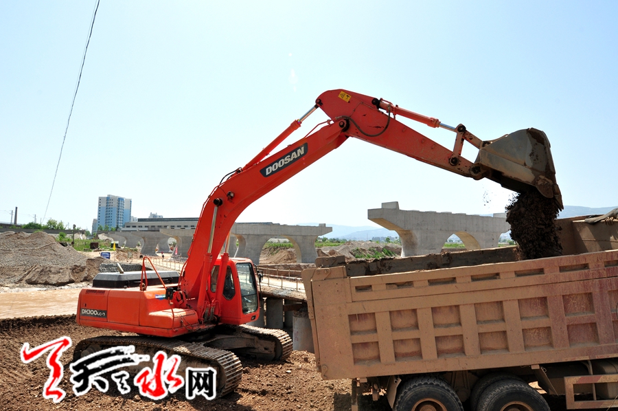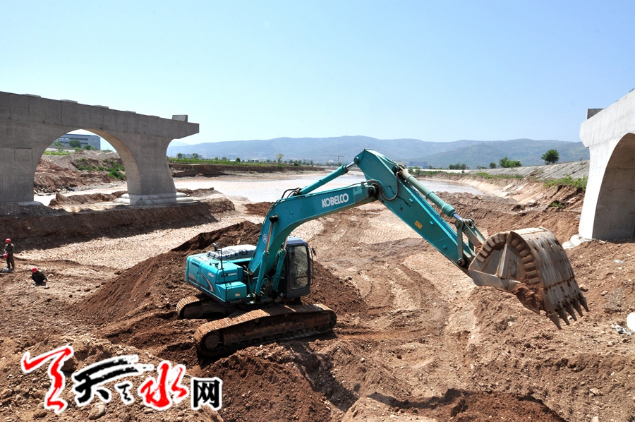 ??? 天天天水網(wǎng)訊(記者 何永德) 5月7日下午,麥積區(qū)峽口渭河大橋建設(shè)現(xiàn)場挖掘機正在渭河中清運沙土。施工人員正在加緊作業(yè),計劃今年年底竣工。