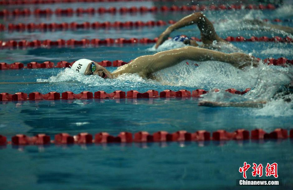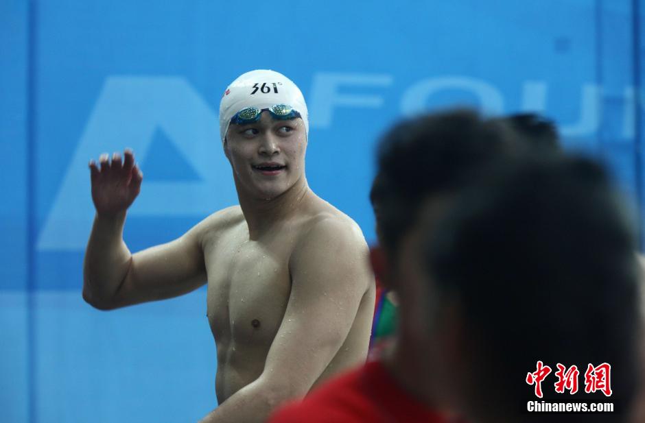 ????5月12日上午,中國(guó)男子泳壇領(lǐng)軍人物孫楊亮相青島體育中心國(guó)信游泳館,參加2014年中國(guó)游泳冠軍賽暨仁川亞運(yùn)會(huì)選拔賽預(yù)賽。據(jù)悉,孫楊將參加男子200米和400米自由泳比賽,而其主項(xiàng)1500米則極有可能“選擇性放棄”。從去年11月起,孫楊就因無(wú)證駕駛事件遭到停訓(xùn)、停賽、停止一切商業(yè)活動(dòng)的“三?!碧幜P。上月末,孫楊 “解禁”, 復(fù)出后首戰(zhàn)青島。中新社發(fā) 徐崇德 攝
