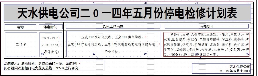 天水供電公司二0一四年五月份停電檢修計(jì)劃表